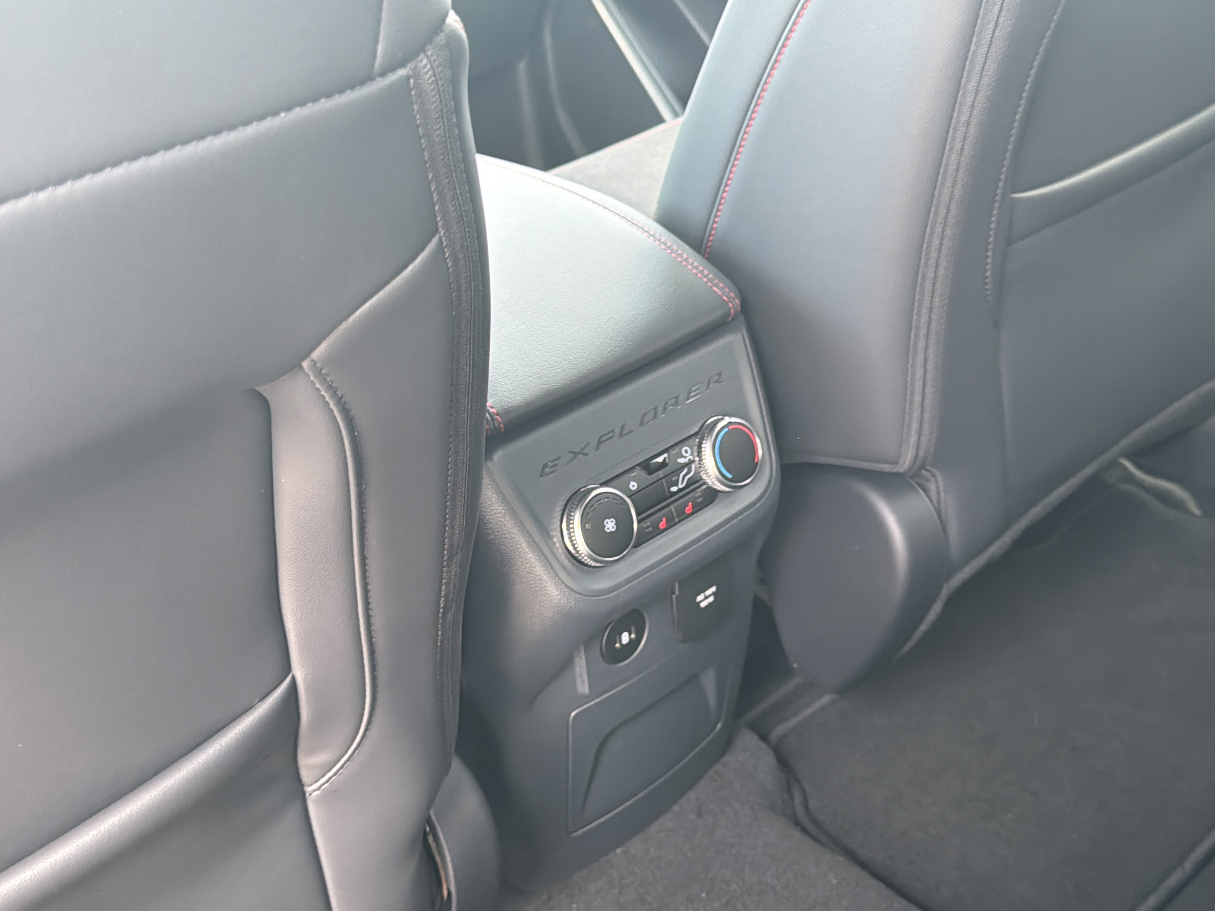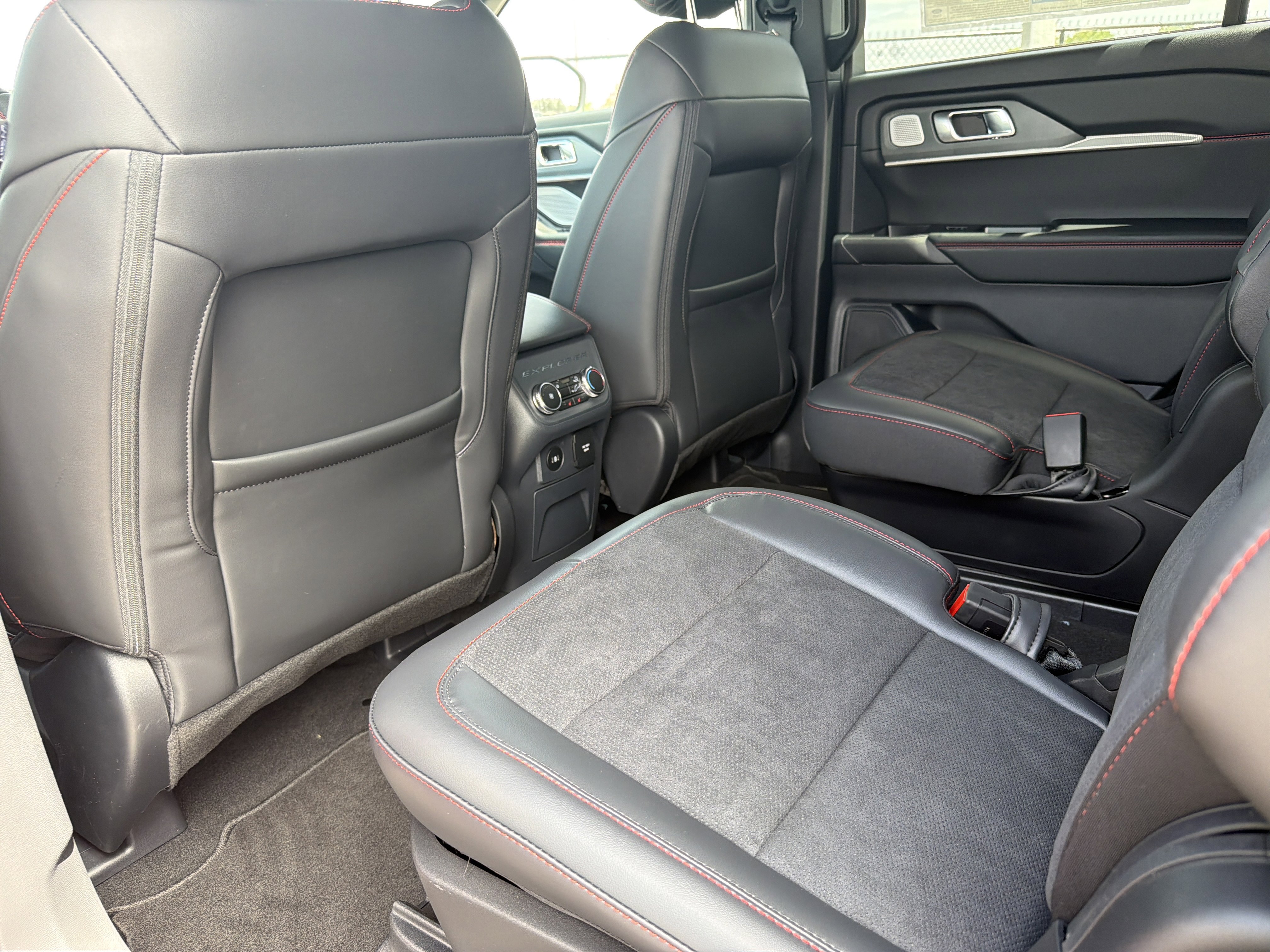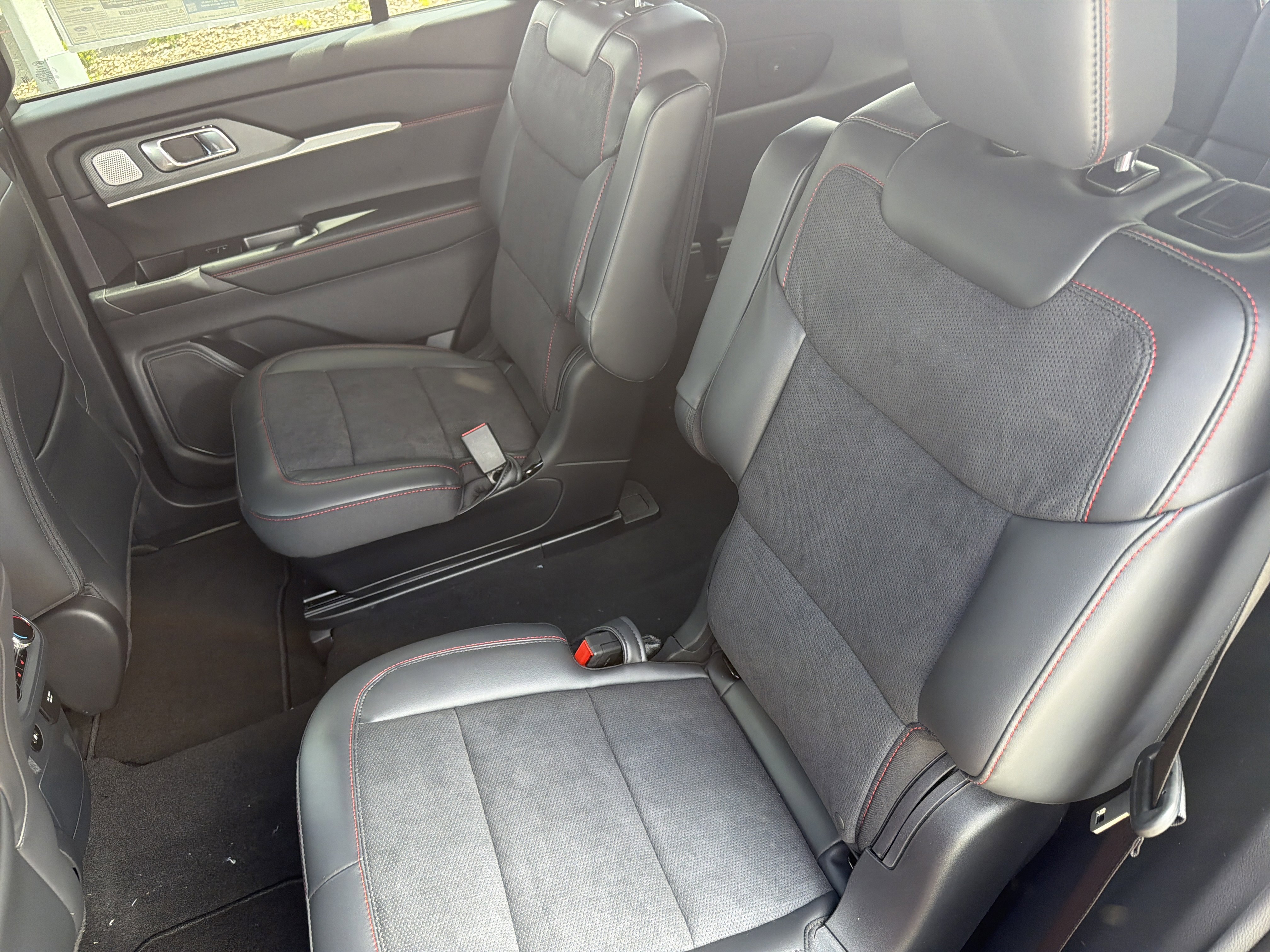 Exterior features include 'Explorer' hood badging, a Class III trailer tow package, and a power liftgate, complemented by a black mesh grille insert and LED headlamps for a striking appearance. Inside, the vehicle boasts a 12.3-inch LCD digital cluster, heated and ventilated front seats, and a powerfold third-row seat, all accentuated by red stitch accents. Functional highlights such as a 13.2-inch LCD touchscreen, 360-degree camera, and sport-tuned suspension ensure a dynamic driving experience. Safety is prioritized with features like Advancetrac with RSC, dual-stage front airbags, and a personal safety system. The vehicle is backed by a 3-year/36,000-mile bumper-to-bumper warranty and a 5-year/60,000-mile powertrain warranty.