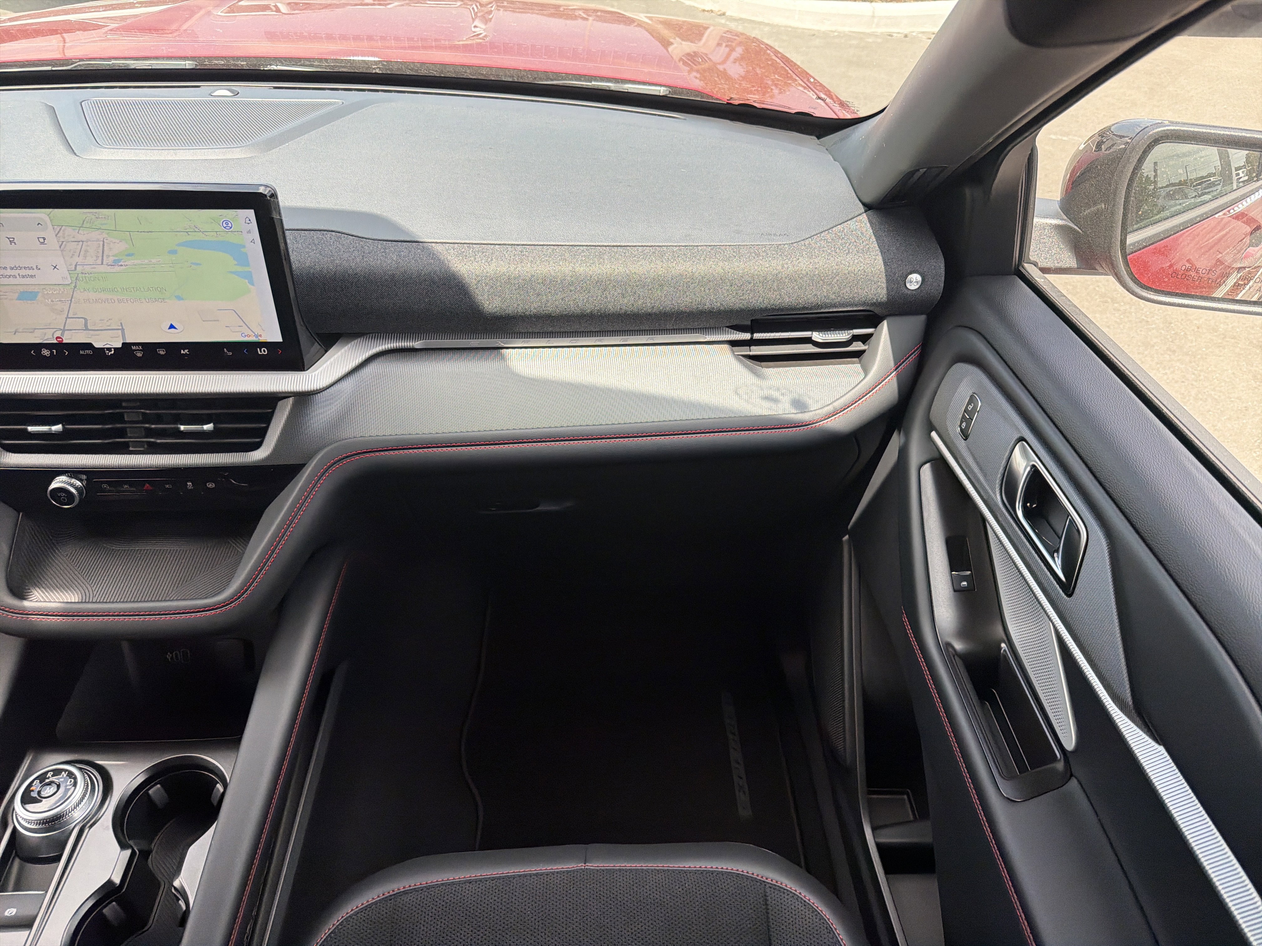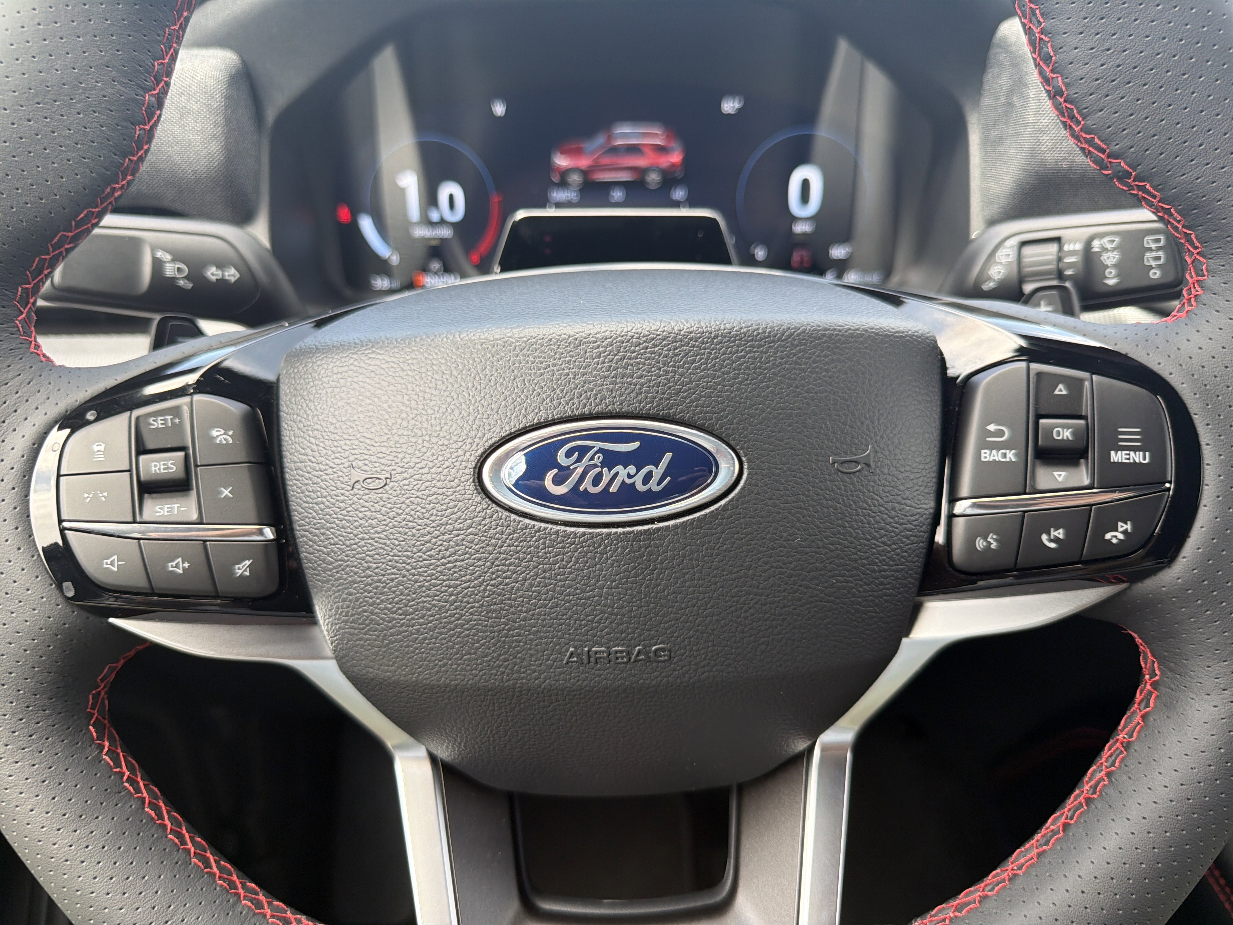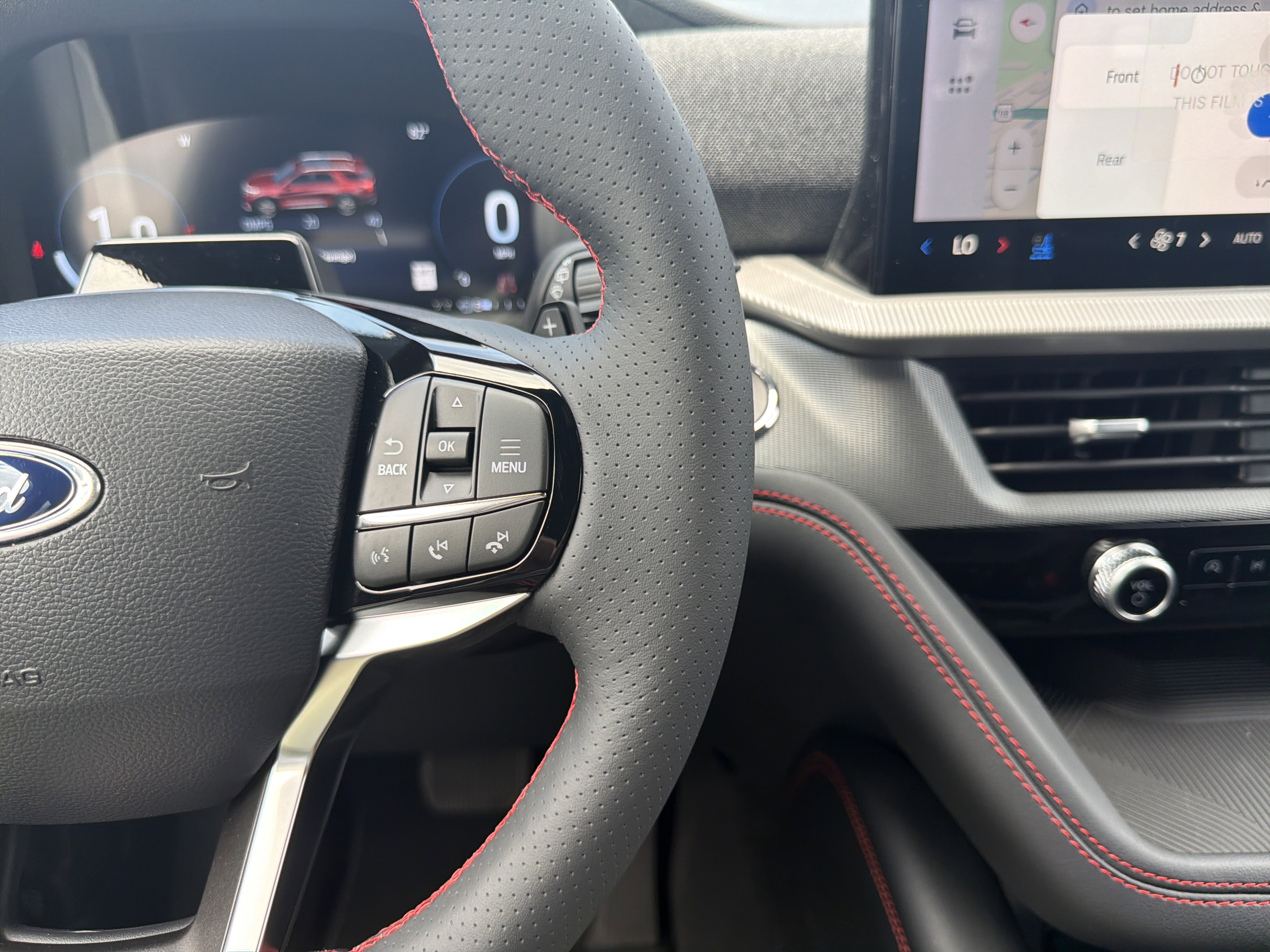 Exterior features include 'Explorer' hood badging, a Class III trailer tow package, and a power liftgate, complemented by a black mesh grille insert and LED headlamps for a striking appearance. Inside, the vehicle boasts a 12.3-inch LCD digital cluster, heated and ventilated front seats, and a powerfold third-row seat, all accentuated by red stitch accents. Functional highlights such as a 13.2-inch LCD touchscreen, 360-degree camera, and sport-tuned suspension ensure a dynamic driving experience. Safety is prioritized with features like Advancetrac with RSC, dual-stage front airbags, and a personal safety system. The vehicle is backed by a 3-year/36,000-mile bumper-to-bumper warranty and a 5-year/60,000-mile powertrain warranty.