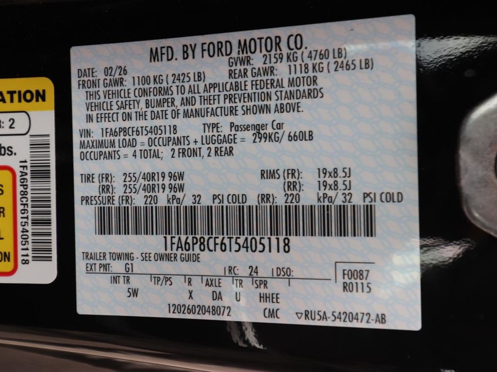 3.55 Limited Slip Rear Axle, ABS brakes, Active Anti-Theft System, Active Valve Performance Exhaust, Alloy wheels, Aluminum Foot Pedals, AM/FM Stereo, Anti-Theft Package, B&O Sound System by Bang & Olufsen with 12 Speakers, Black Mirror Caps, Black Painted Wedge Decklid Spoiler, Compass, Driver Seat Memory with 3 Settings, Electronic Stability Control, Equipment Group 401A High Package, Floor Mats, 1st Row, Black with City Silver GT Logo, Ford Co-Pilot360 Assist+, Ford Connectivity Package (one-Time Purchase - 7 Years), Front dual zone A/C, HD Radio, Headlamps with Black Bezels, Heated front seats, Illuminated entry, Leather-Trimmed Bucket Seats with Color Accents, Locking Center Console, Low tire pressure warning, Magnesium Framed Panoramic Curved Display, Mustang Nite Pony Package with Shadow Black Paint, One-Year Connected Navigation, Perimeter Alarm, Pre-Collision Assist with Automatic Emergency Braking, Race Red Seat Belt, Remote keyless entry, SiriusXM with 360L, SYNC 4, Traction control, Wheel Locking Kit, Wheels: 19" x 8.5" Shadow Silver-Painted Aluminum.