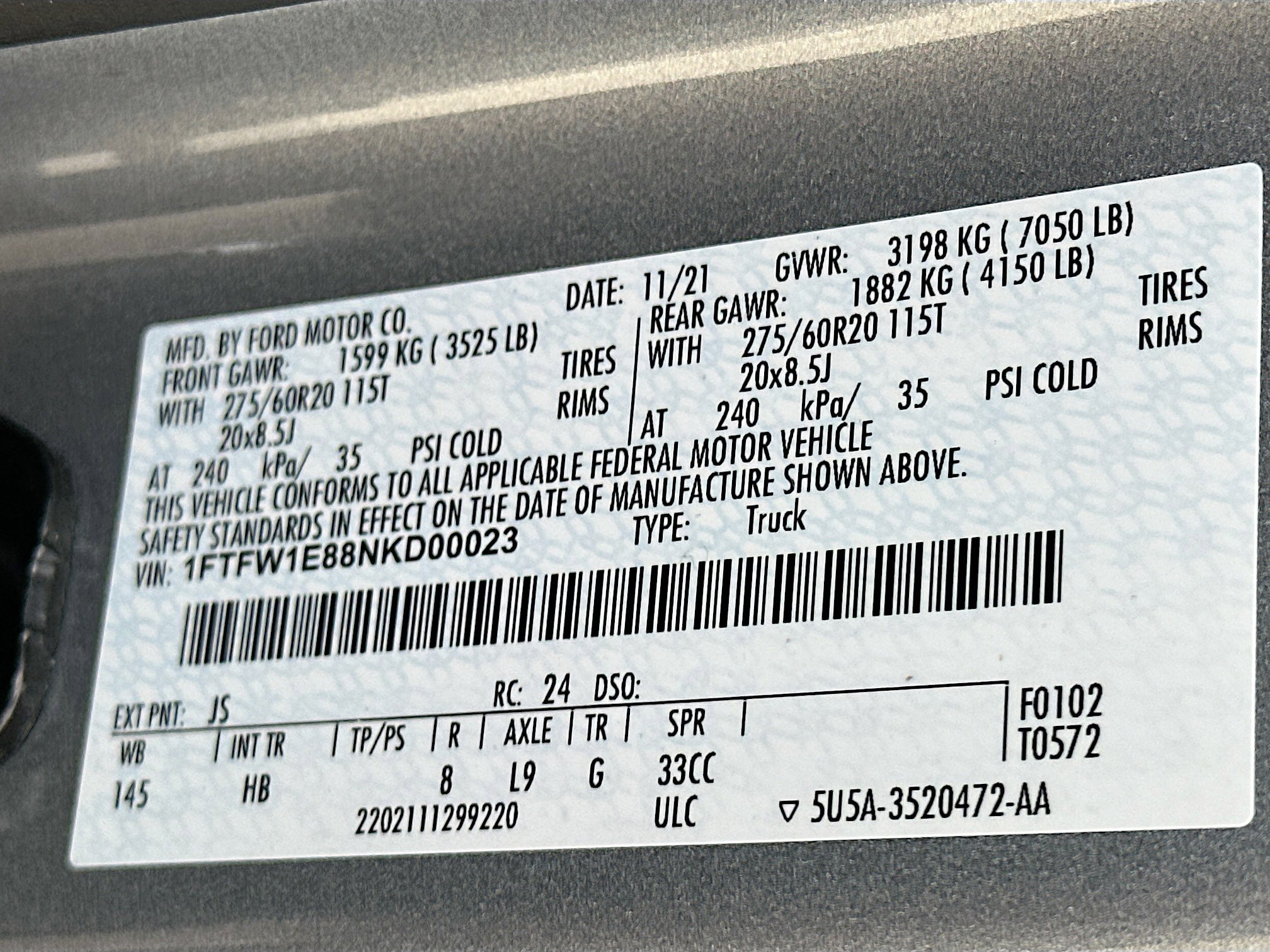 • VIN # 1FTFW1E88NKD00023